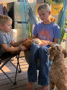 We have always been dog lovers, and we have had them as part of our family all our adult lives. Our kids have been the “official puppy socializers” for mom and Brent virtually since they were born, especially our daughter, who is always sneaking away to help her Nana and Papa with the puppies! They are all over the moon excited to be able to have puppies right in the middle of our home now too!